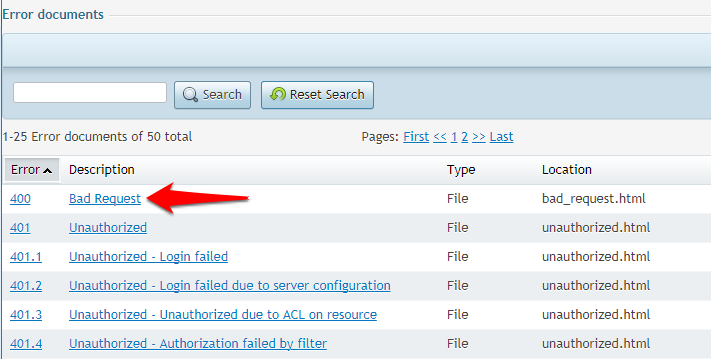 Example: Your domain name is example.com, and you have created a file named badrequest_400_1.html and saved it in the httpdocs\my_errors directory. To use this file as an error document, you need to type the following URL into the Location field: https://example.com/my_errors/badrequest_400_1.html.