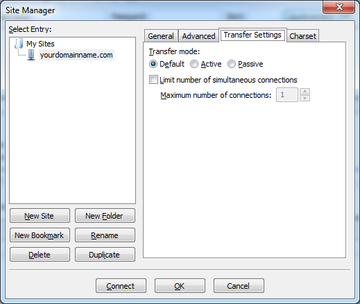 Select yourdomainname.com and click the Transfer settings tab. Here, you can change the data connection mode to Active or Passive.