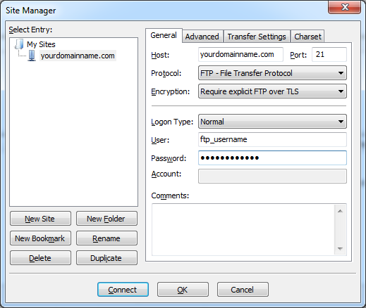 Provide the following details, label the entry as yourdomainname.com and click the Connect button: