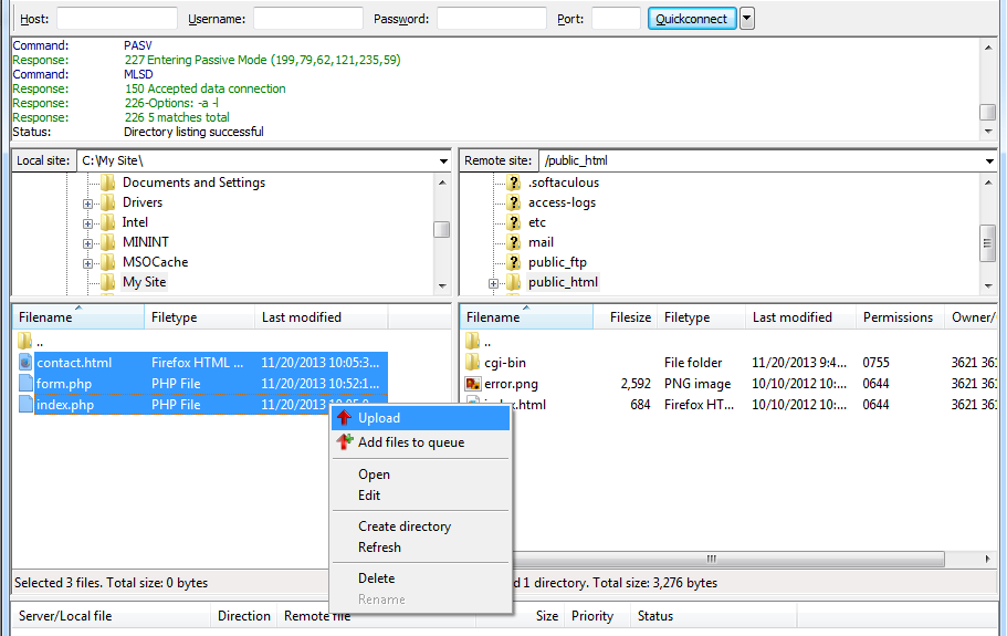 In the left pane, select the files to upload. Right-click and choose Upload.